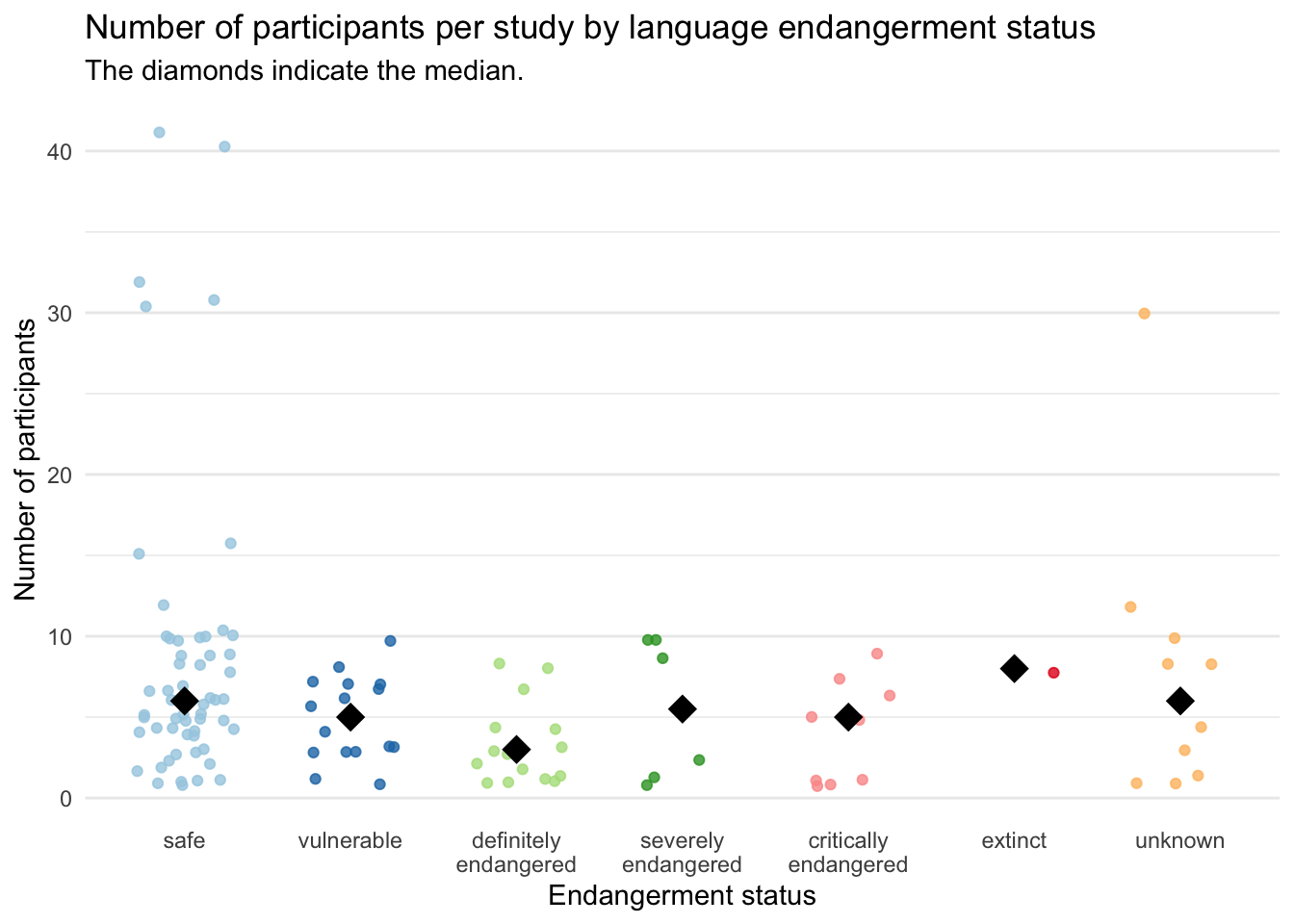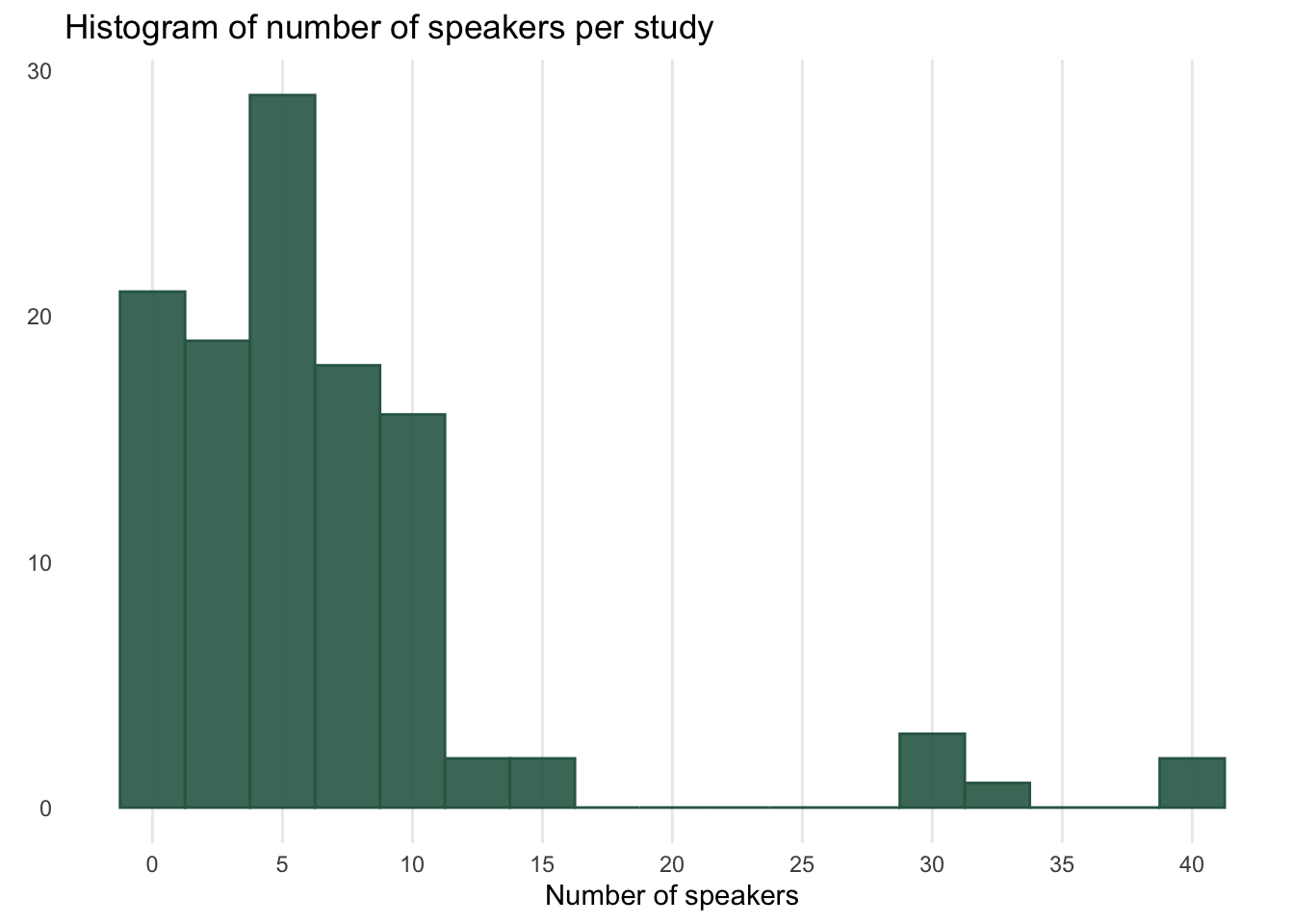 The dataset contains data from 113 studies, published between 1955 and 2017 (the bulk of studies is within the range 1990-2017 though). The median number of speakers per study is 5. (An estimate of number of speakers per study in phonetics, Coretta 2019).