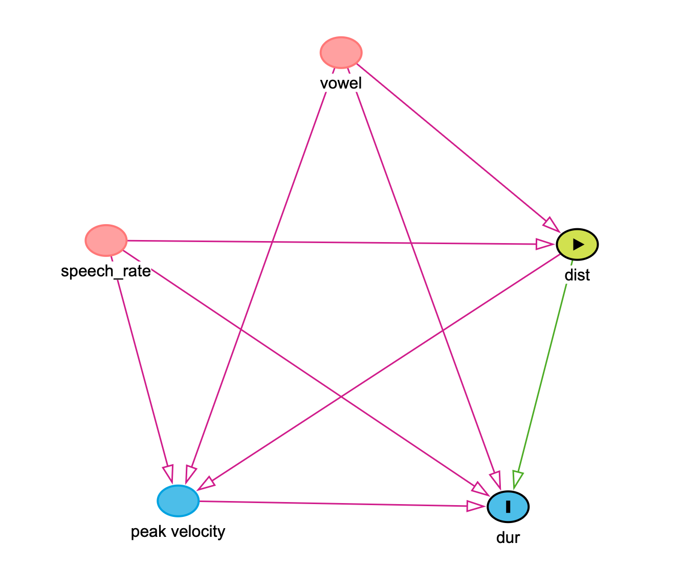 To estimate the direct causal effect of vowel and speech rate on distance: